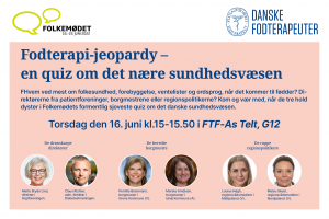 | Oversigt over Danske Fodterapeuters program på Folkemødet 2022 Torsdag den 16. juni kl. 15.00-15.50: Fodterapi-jeopardy i FTF-As telt, G12 Fredag den 17. juni kl. 15.00-15.45 i Det fælles sundhedstelt, Kæmpestranden Fredag den 17. juni kl. 16.00-17.00: Mød en fodterapeut blandt hverdagens Sundhedshelte hos Styrelsen for Patientsikkerhed, J37. |